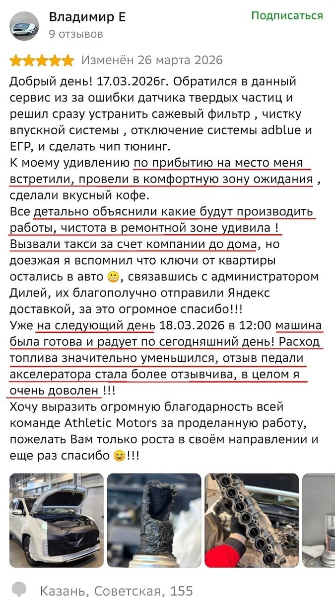 Владелец приезжал к нам на комплекс: - удаление сажевого фильтра - чистка впускной системы - отключение AdBlue и EGR - увеличение мощности С автомобилем работали мастера Айдар и Азат. Владимир, благодарим за доверие и обратную связь!🙂 Больше отзывов о нас можно почитать: 📍 на Яндекс 📍 в 2ГИС Мы работаем по записи: Написать нам в WA/TG/MAX +79033054194 Оставить заявку здесь