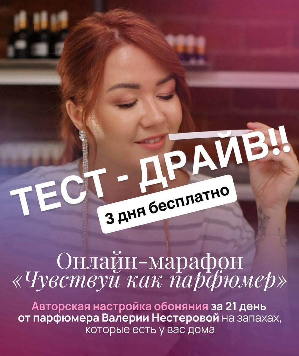 Хотелось бы улучшить чувствительность носа, чтобы слышать глубже/больше оттенков? + анализировать парфюмы глубже? Я хочу дать тебе возможность попробовать это на практике. В простом формате & с доступными материалами! Я открываю 3-дневный тест-драйв марафона «Чувствуй как парфюмер» Формат очень простой: ⌛️ 7–15 минут в день 👌🏻 работа с базовыми ароматами 👣 первые шаги в разборе запаха на ноты Ты попробуешь на: • лимоне • розе • корице Поймешь механизм. Но самое интересное будет дальше. Потому что реальный результат раскрывается за 21 день. Вот что происходит у участников уже через 10 дней: • 97% начинают глубже анализировать ароматы и замечать оттенки, которые раньше не чувствовали • 73% легче описывают, что они ощущают • 33% начинают выбирать ароматы осознанно и замечают их влияние на состояние • 33% формируют свой стиль восприятия и описания Важно: ❌ мы не заучиваем ноты ✅ мы учимся чувствовать через реальный мир Потому что всё вокруг пахнет - и именно этим вдохновляются пар