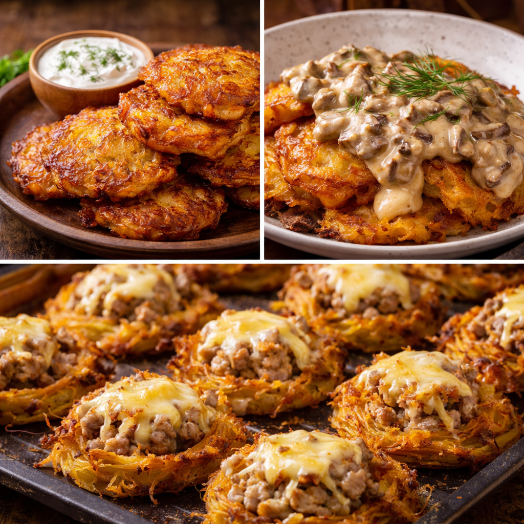 Русские драники с секретным ингредиентом: классические, с грибной подливкой и запечённые «гнёзда» с мясом
