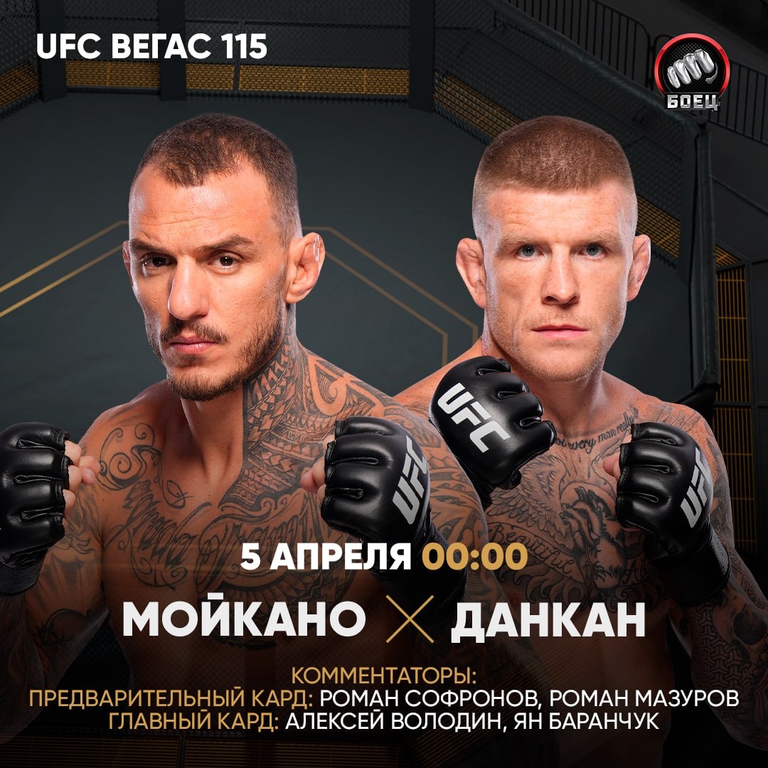 В этот раз отправляемся в Вегас ⚔️ UFC Вегас 115 возглавят Мойкано и Данкан. Ренато идет на серии из двух поражений, а вот у Криса четыре победы подряд 😎 В со-главном событии октагон разделят Яндироба и Риччи 👊 Также не пропустите второй поединок Яхьяева в UFC. Он проведет поединок с Рибейро. В прелимах поболеем за Бекоева. Азамата ожидает испытание в виде Гора ✊ Трансляция стартует в 0:00 по московскому времени. Встречаемся на Матч!Боец 📺 Матч! Боец в телеграм | МАХ