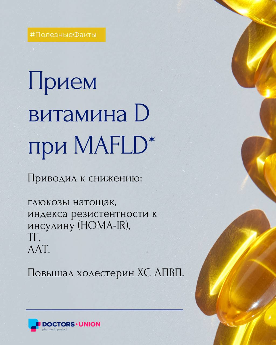💡Новый метаанализ показал снижение глюкозы натощак, триглицеридов, АЛТ при приеме добавок с витамином D при MAFLD* Однако витамин D не влиял на уровень общего холестерина и ХС ЛПНП. *MAFLD — метаболически ассоциированная жировая болезнь печени Источник: Effect of Vitamin D Supplementation on Metabolic Parameters in Patients with Metabolic-Associated Fatty Liver Disease: A Systematic Review and Meta-Analysis of Randomized Controlled Trials.The Journal of Nutrition, April, 2026 Читайте новости на «Союзе Докторов»