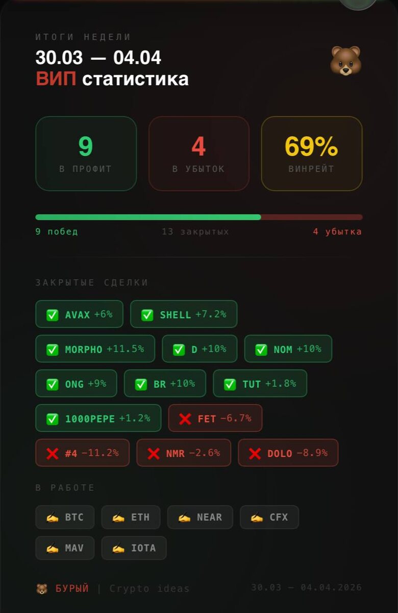 Неделя была сложная. Боковик, манипуляции, рынок на нервах. Но цифры говорят сами за себя: ✅ 9 сделок в профит ❌ 4 в убыток 📊 Винрейт 69% Лучшие: MORPHO +11.5%, D +10%, NOM +10%, BR +10% Неудачные: #4 -11.2%, DOLO -8.9% Ещё 6 сделок в работе — BTC, ETH, NEAR, CFX, MAV, IOTA. Следим. Рынок давал мало — брал что давал. Без форса. 🐻 Полная статистика и все сделки — в ВИП. Подробности в закреплённом посте. #итоги #статистика #вип