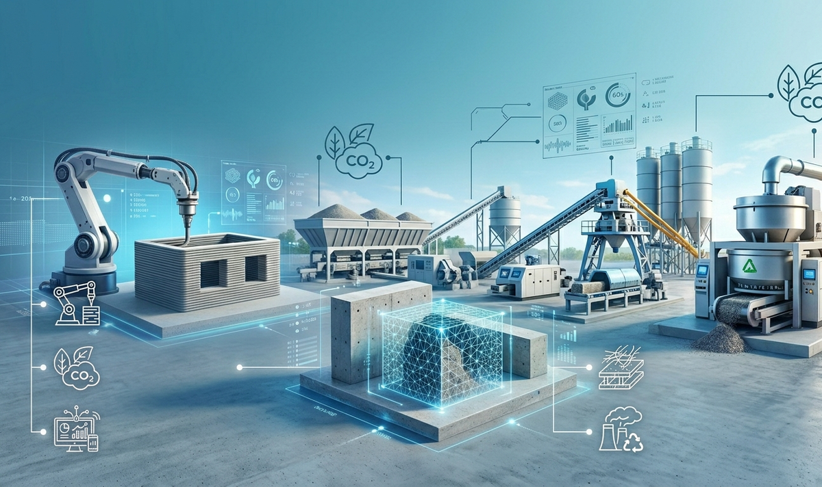 Бетон остается фундаментом современного строительства, но требования к нему постоянно растут. Сегодня инженеры и химики работают над тем, чтобы сделать этот материал не просто прочным, но и «умным». Рассмотрим пять ключевых технологий, которые уже начинают менять отрасль и в ближайшие десятилетия могут стать стандартом для БСУ (бетонно-смесительных узлов) по всему миру. 1. Самоочищающийся (фотокаталитический) бетон Основной проблемой городских фасадов является их быстрое загрязнение из-за смога и пыли. Решением стало добавление в состав смеси диоксида титана ($TiO_2$). Под воздействием ультрафиолетовых лучей это вещество запускает реакцию окисления, которая расщепляет органические загрязнения на поверхности. Оставшиеся частицы легко смываются дождем, позволяя зданиям сохранять первоначальный вид без дорогостоящей чистки. 2. Самовосстанавливающийся биобетон Микротрещины — главная причина коррозии арматуры и разрушения конструкций. Ученые разработали бетон, в состав которого вводятся кап