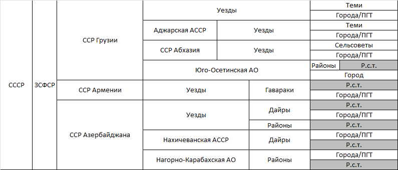 Ещё раз, напомню территориальное деление обозреваемых регионов. Название отдельных мелких единиц можно увидеть в отдельных статьях по Армянской ССР и Азербайджанской ССР в их первых частях. По Грузинской ССР такового нет, поскольку очень большое дробление, но базовые основы там также хорошо расписаны.