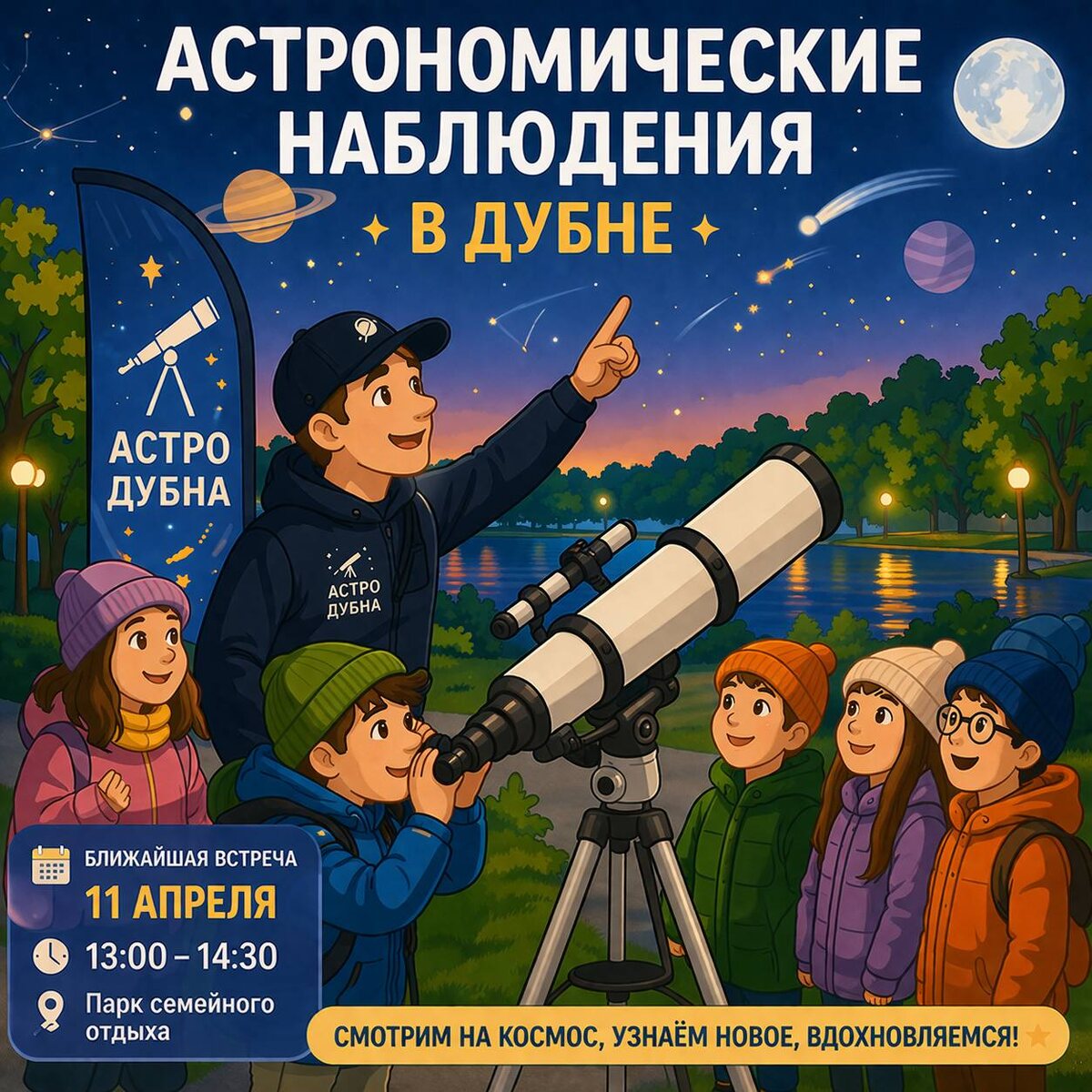 🌌 С наступлением тёплой погоды жители и гости города снова смогут посмотреть на космос через профессиональные телескопы. Открытые встречи проводят участники клуба «АстроДубна» — это не просто наблюдения, а настоящий научпоп под открытым небом: всё объясняют, показывают и отвечают на вопросы. Как отмечают организаторы, такие встречи дают возможность увидеть космос каждому — даже тем, у кого нет собственного телескопа. Наблюдения будут проходить до октября. Планируется не менее пяти встреч, но точные даты зависят от погоды. 📅 Ближайшее событие — 11 апреля с 13:00 до 14:30 в парке семейного отдыха. Можно будет понаблюдать протуберанцы через специальный солнечный телескоп ☀️