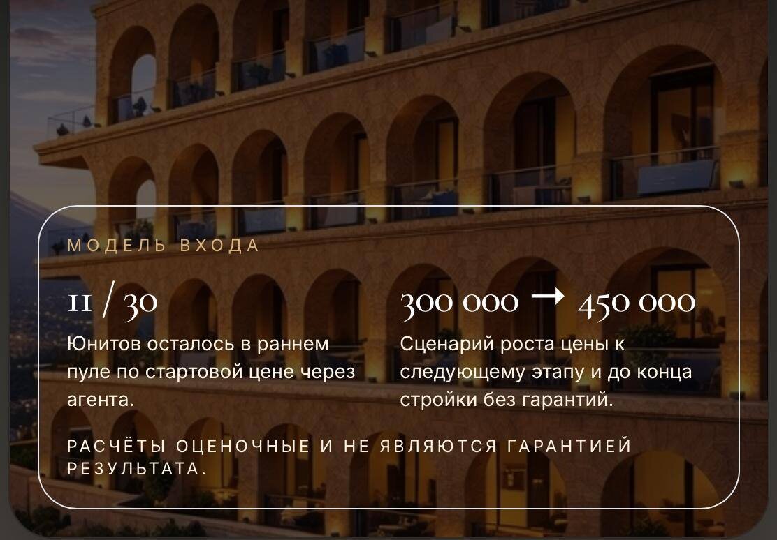 ВЫГОДА Вход начинается от 4 500 000 ₽, а ранняя цена через агента ориентируется на 300 000 ₽/м². Следующий ориентир модели — 450 000 ₽/м². БЕЗОПАСНОСТЬ 250 000 ₽ оплачиваются при подписании договоров. После открытия счёта и эскроу вносится 10%, а дальше платежи идут по поэтапному графику с финальными 50% после ввода объекта ( детали уточняются на консультации). АРМЕНИЯ И ЕРЕВАН Норк-Мараш даёт премиальную спокойную среду рядом с центром: 10 минут до Площади Республики, 8 минут до Оперы и 8 минут до Каскада. Это усиливает и туристический, и деловой спрос. ДОВЕРИЕ За проектом стоит не абстрактная витрина, а люди и личная репутация: Basina • Gergel • Mayer, понятная модель сопровождения и уважение к капиталу инвестора. Приходите на консультацию @lyubovgorodilova #Армения #доход #ереван #консультация