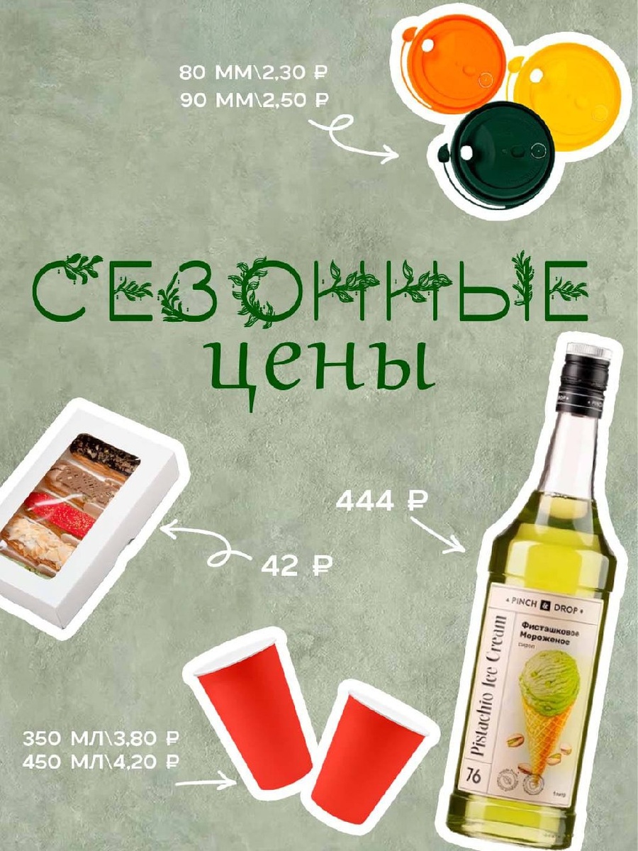 🛍 Весна — время освежать меню, витрины и подачу. Поэтому мы подготовили сезонные цены на популярные товары для кофеен , ресторанов и доставки: 🔘Сироп Pinch&Drop «Фисташковое мороженое» — 444 ₽ Яркий вкус для весенних напитков и десертов. 🔘Цветные крышки 80 мм — 2,30 ₽ 90 мм — 2,50 ₽ Жёлтые, оранжевые и зелёные — добавят весенних красок при подаче. 🔴Красные однослойные стаканы 350 мл — 3,80 ₽ 450 мл — 4,20 ₽ Стильный акцент для подачи кофе. 🟢Упаковка ForG ECLAIR (белая) — 42 ₽ Отлично подходит для десертов и витринной подачи. Ознакомиться с ассортиментом и оформить заказ можно: ✅на сайте Ecoroom 🔣 https://ecoroomdn.ru/ ✅в TG @requestec ✅по номеру телефона: +79900332199 ОСТАВАЙТЕСЬ С НАМИ. СКОРО БУДЕТ ЛЕТНЕЕ ПРЕДЛОЖЕНИЕ 💛