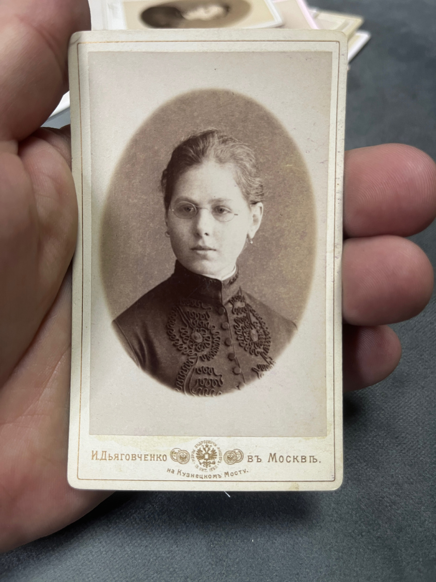 · «Портрет-визит» (Carte de visite): маленькая фотокарточка (примерно 6×9 см), наклеенная на картонную подложку с указанием адреса фотоателье. Это был самый демократичный и массовый формат, их часто дарили всем учителям-предметникам.