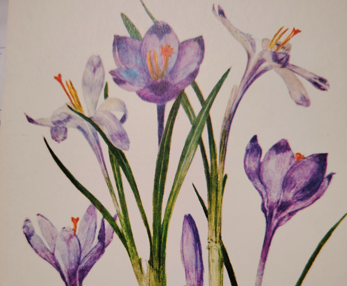 🌱 Крупные сиреневые цветки с длинными красными рыльцами (у садовых крокусов рельца короткие желтые).
