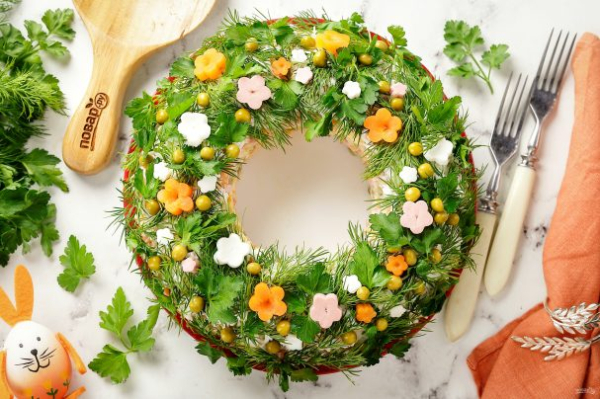 Хорошо известный всем салат, приготовленный в стиле тематических блюд к пасхальному столу. Такая подача порадует гостей своей внешней оригинальностью, а какой рецепт вы возьмёте за основу совершенно неважно. Предлагаю приготовить салат "Пасхальный венок" из салата "Оливье". Красивое оформление привлечёт внимание всех гостей и пополнит список любимых пасхальных рецептов.