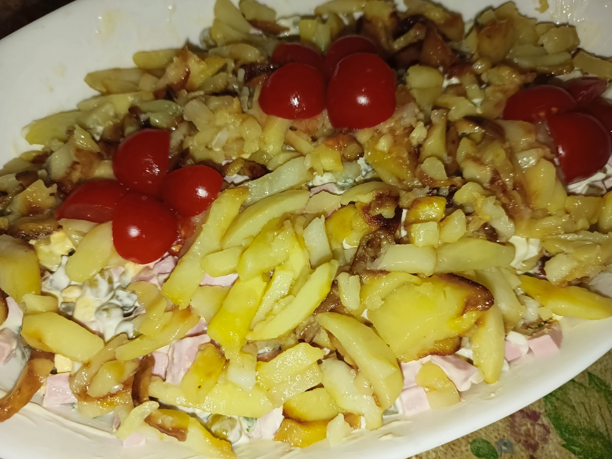Сверху на салат выкладываем готовую картошку, украшаем помидорами черри.