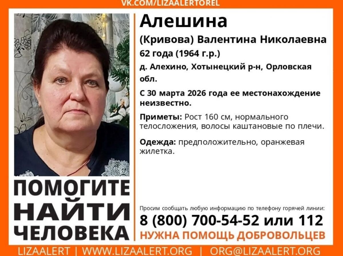 В Орле с конца марта ищут женщину с каштановыми волосами. Об этом сообщили в сообществе поискового отряда «ЛизаАлерт». Валентина Алешина (Кривова) пропала 30 марта. Женщине 62 года, она около 160 см ростом и имеет нормальное телосложение. Предположительно, в день пропажи Валентина Алешина была одета в оранжевую жилетку.