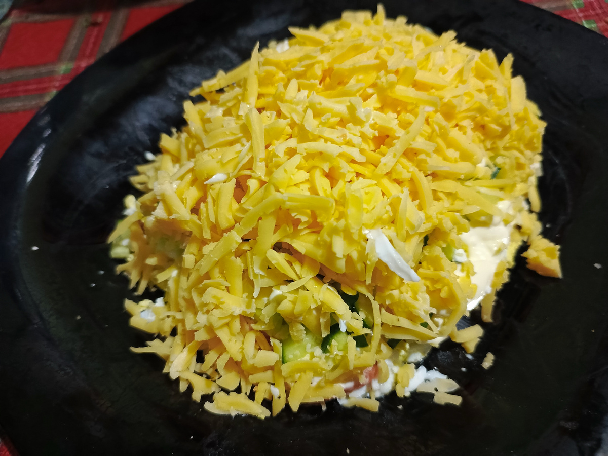 На плоскую тарелку выкладываем нарезанную красную рыбку, затем сеточка из майонеза, далее слой тертых вареных яиц и сеточка из майонеза, далее слой свежих огурцов и сеточка из майонеза, последний слой - тертый сыр. Салатик готов!