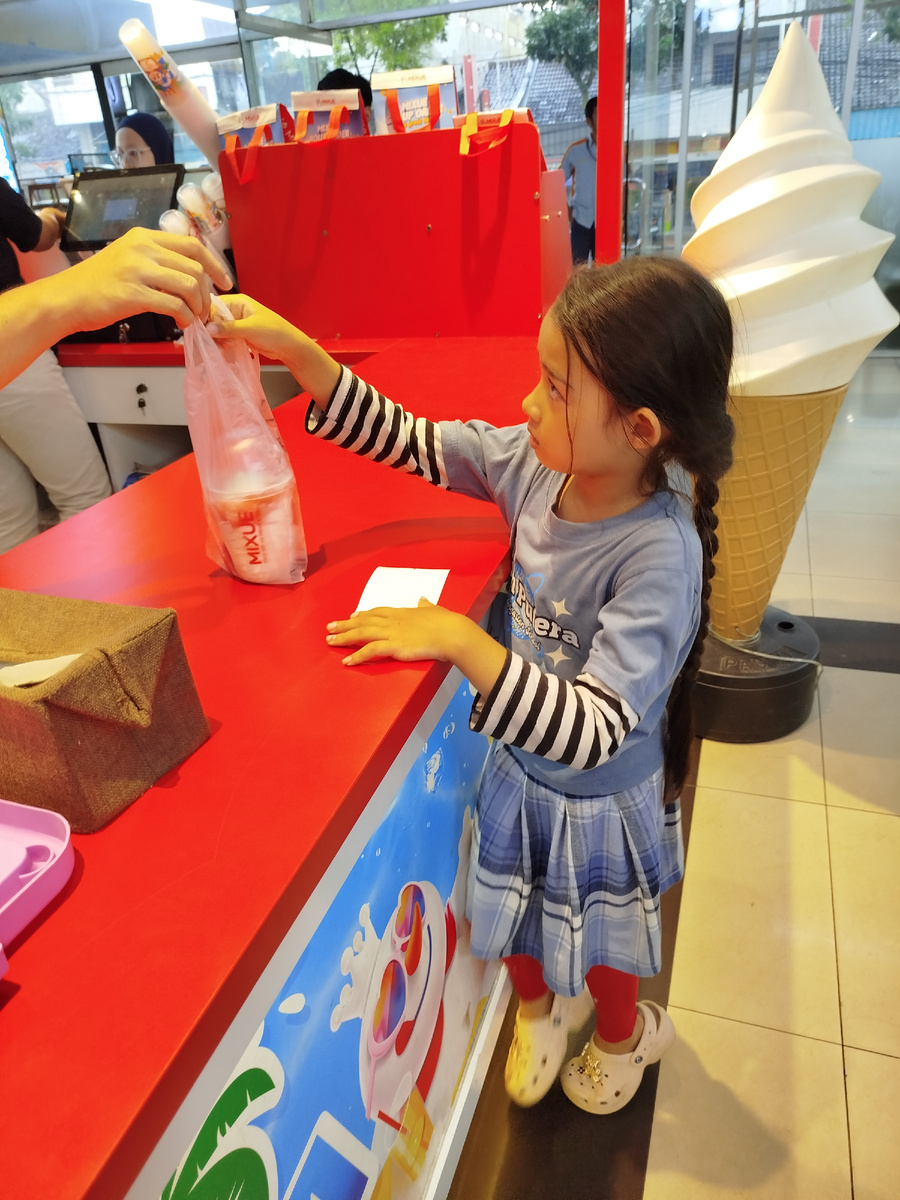 Первым делом в нашем ТЦ Амира купила мороженое в "Мисуэ" - ванильное с персиком