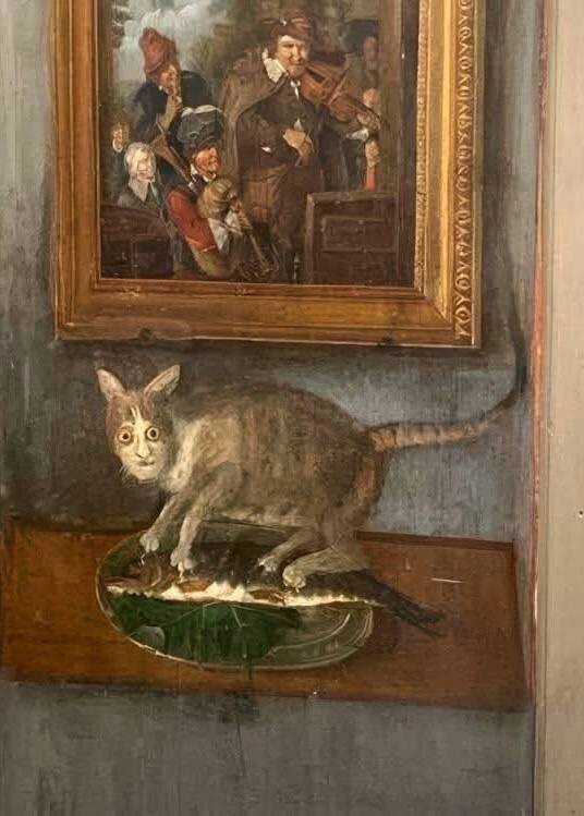 Эта картина, изображающая кота, пытающегося украсть рыбу всеми четырьмя лапами, была написана в XVII веке на деревянной панели дома Матье Мига в Мюлузе, Франция. Сейчас она находится в Историческом музее Мюлуза. По всей видимости, пушистый вор сбежал до того, как художник смог как следует запечатлеть кота, вот незадача! 😹 Неизвестный художник.