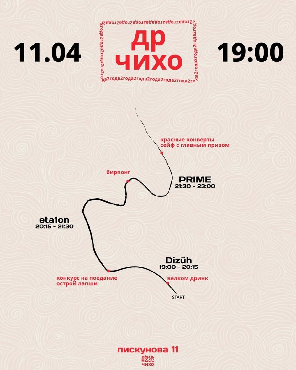 ! 11 апреля — 2 года в программе: — диджеи, чтобы ты забыл, как стоять на одном месте Dizüh 19:00 - 20:15 eta1on 20:15 - 21:30 PRIME 21:30 - 23:00 — на старте велком дринк для хорошего настроения — конкурс на скорость поедания острой лапши [плакать нельзя] — сейф с сюрпризом + всеми полюбившиеся красные конверты — бирпоооонг 11.04 / 19:00 ЧИХО, пискунова 11 😄 Мероприятия Нижний Новгород. Я местный! 📱 Telegram | 📲 MAX