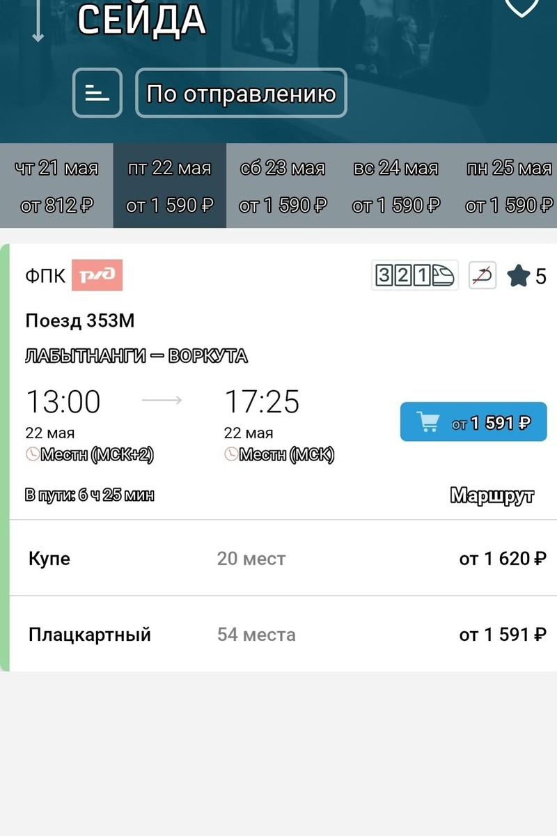 Уважаемые туристы! С 22 мая в составе поезда "Лабытнанги - Воркута" не предусмотрен вагон с сидячими местами (общий