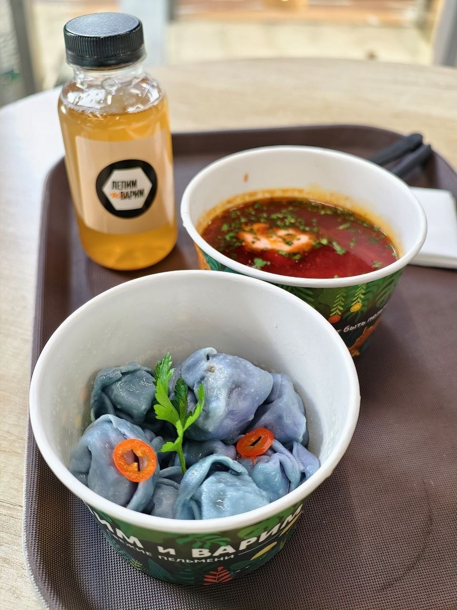 А вот ещё вариантик ланча в Красном Ките, что в Мытищах. Там недавно открылась Московская сеть "Лепим Варим", известная своими пельменями. Цена комбо 679 рублей. Борщ достойный, мясо присутствует. Пельмени просто шикарные, мясо рубленое, тесто тонкое, а вот компот как будто перебродил. Ставим 7/10 Цена не самая низкая и вопросики по напитку. За такие деньги могли бы салатик добавить)))