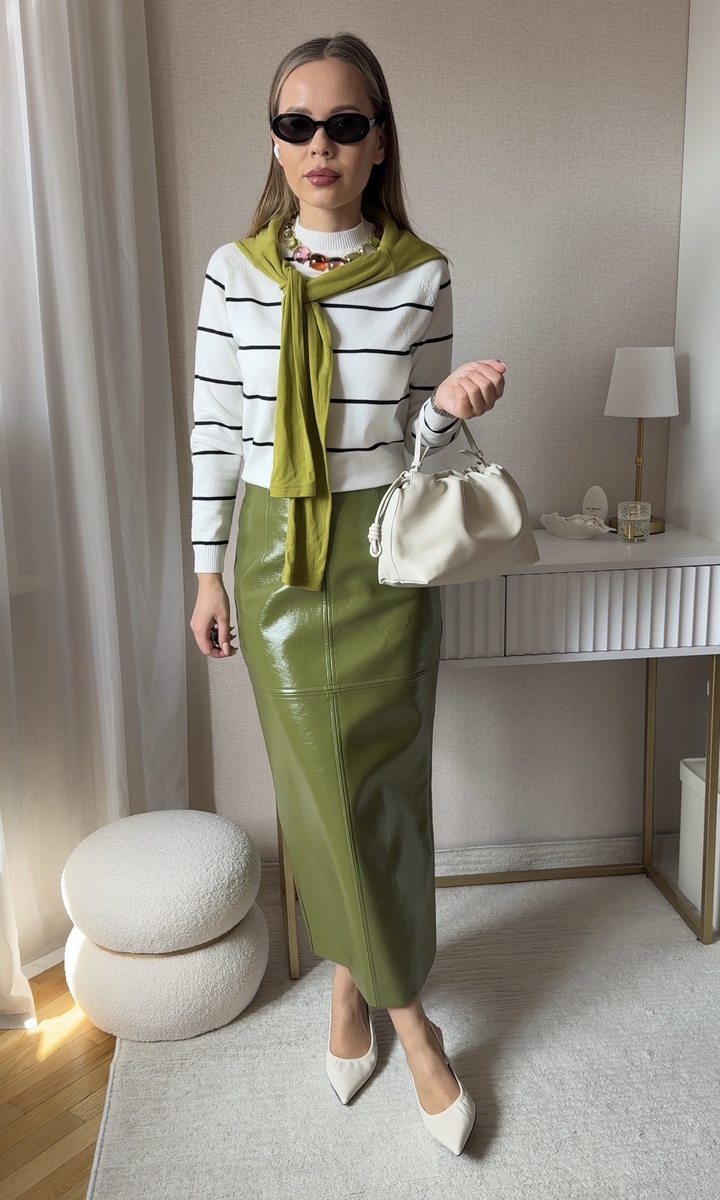 📍Полоска — один из самых простых способов «освежить» образ. Она добавляет ритм и делает даже базовые сочетания визуально сложнее. Особенно хорошо это видно в паре с мини-юбкой в клетку пепита — за счёт разного масштаба и направления принтов получается гармоничный, но небанальный микс.