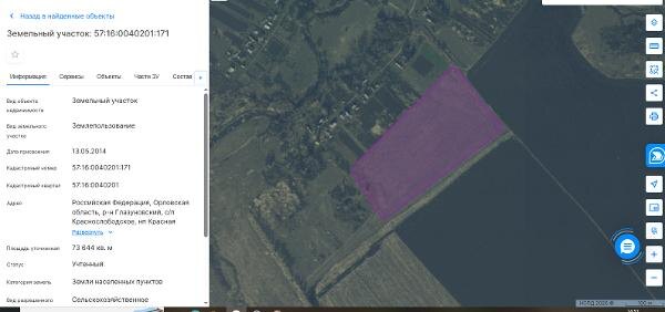 Название: земельный участок общей площадью 73 644 кв.м., кадастровый номер: 57:16:0040201:171, категория земель: земли населенных пунктов