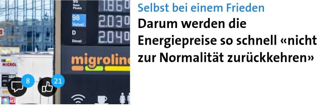 Комиссар по энергетике Европейского союза предупреждает о длительных последствиях. Даже если завтра в Иране будет заключён мир, цены на энергию «в ближайшем будущем» не вернутся к довоенному уровню. В Швейцарии стоимость топлива в зависимости от вида выросла на 11–22 %. Около 30–40 % энергетической инфраструктуры в странах Персидского залива разрушено, а у пролива Хормуз скапливаются суда. Прямого дефицита поставок в Европе не ожидается, но мировая конъюнктура приводит к высоким ценам и в Швейцарии. С начала конфликта в регионе газ подорожал в ЕС примерно на 70 %, нефть — на 60 %. 30 дней войны увеличили импортные расходы ЕС на ископаемое топливо на 14 млрд евро (около 12,9 млрд франков). В Швейцарии, по данным TCS, цены на бензин и дизель с начала войны в Иране поднялись на 11–22 %. Президент США Дональд Трамп заявил, что «достаточно просто покинуть Иран», и тогда цены «обрушатся». Однако для нормализации судоходства сначала нужно снять пробку в Персидском заливе: к началу войн