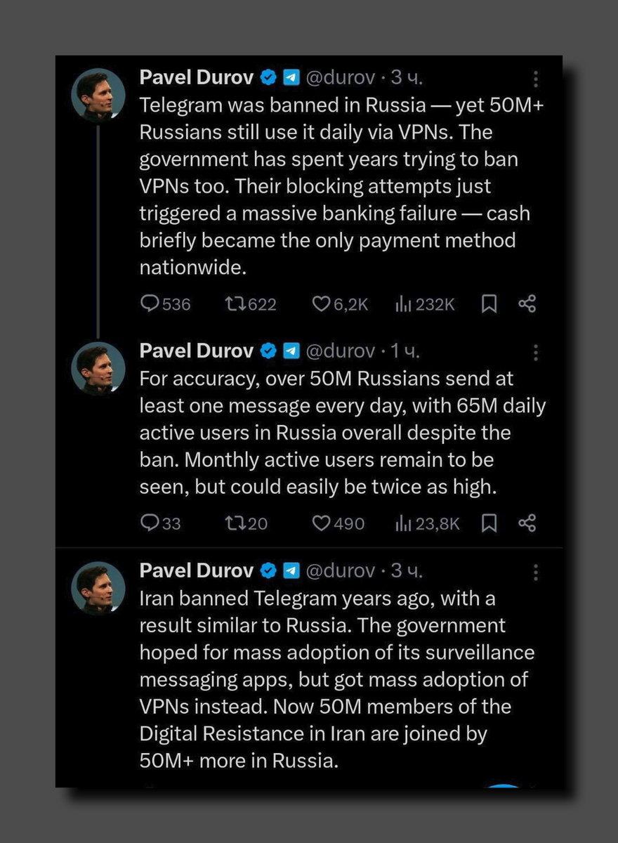 Попытки приручить интернет в очередной раз привели к тому, что цифровые технологии и реальность разошлись в разные стороны. Пока официальные отчеты рисуют картину тотального контроля, основатель Telegram сообщает, что миллионы россиян ежедневно заходят в приложение, используя обходные пути. По его словам, «правительство годами пыталось запретить и VPN», но вместо триумфа цензуры страна получила временный паралич экономики. Когда вчера из-за технических манипуляций в банках всё «зависло», Дуров написал: «Наличные на короткое время стали единственным способом оплаты по всей стране». По утверждению Дурова, ситуация напоминает иранский сценарий. Там тоже власти наивно рассчитывали «на массовое использование своих мессенджеров с функцией слежки, но вместо этого получили массовое распространение VPN». В итоге к 50 миллионам участников «цифрового сопротивления» в Иране теперь «присоединились ещё более 50 млн в России». Дуров, не упуская случая «подлить масла в огонь», объявил о запуске «Цифр