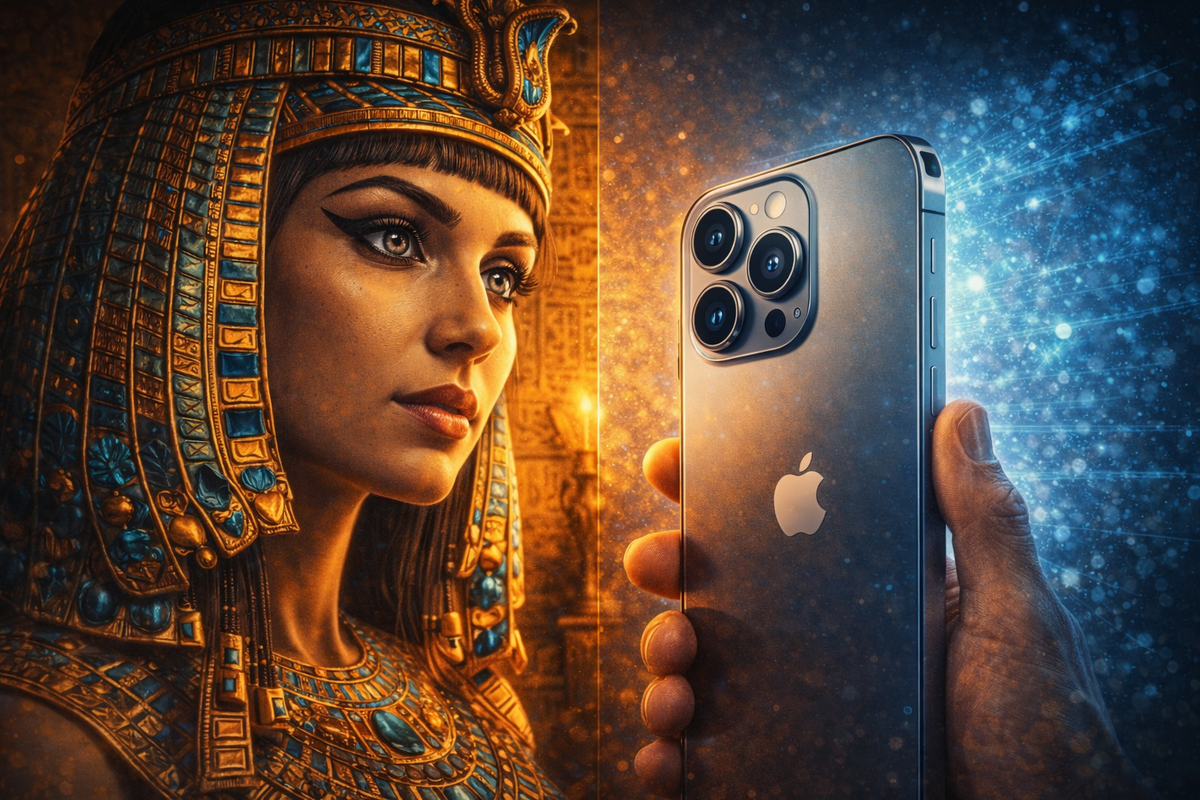 Посчитаем. От строительства пирамид до рождения Клеопатры: около 2500 лет. От рождения Клеопатры до первого iPhone: около 2076 лет.