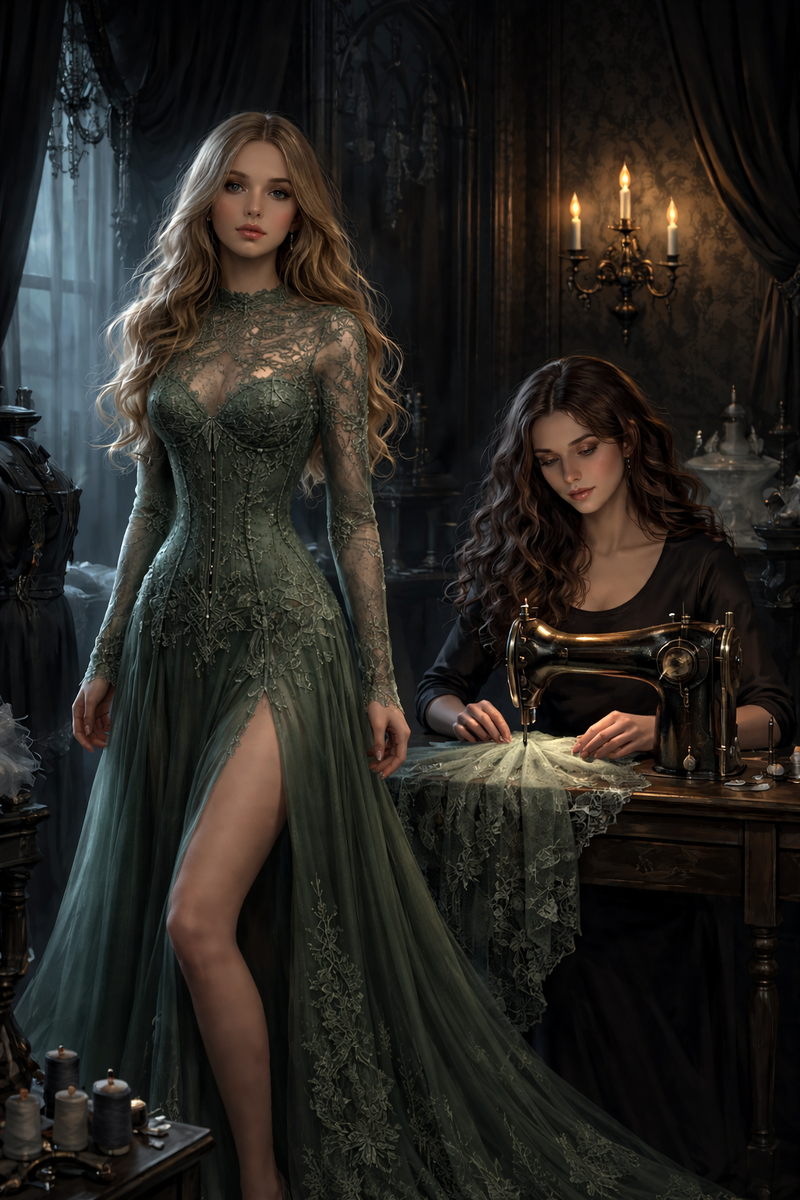-Бледно-зелёное. Как первый весенний мох на старом кладбище. Корсет, который подчеркнёт вашу талию так, что жених забудет, как дышать. Игривое кружево, которое будет намекать, что под ним прячется не ангел, а кое-что поинтереснее. Длинное, с высоким разрезом, готичный силуэт. Вы будете в нём выглядеть, как лесная ведьма, которая решила выйти замуж за смертного.