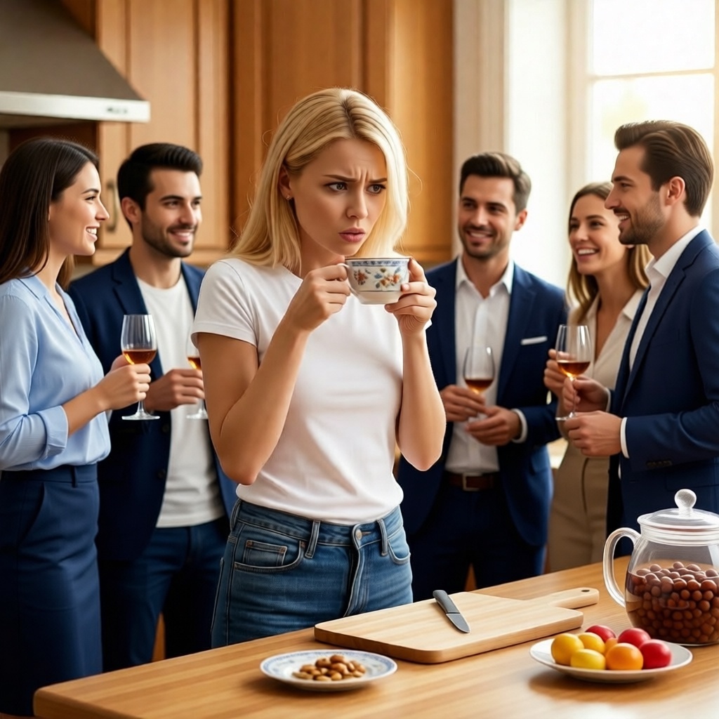 В комнате повисла тишина. Гости замерли с бокалами в руках. Муж удивлённо приподнял брови: