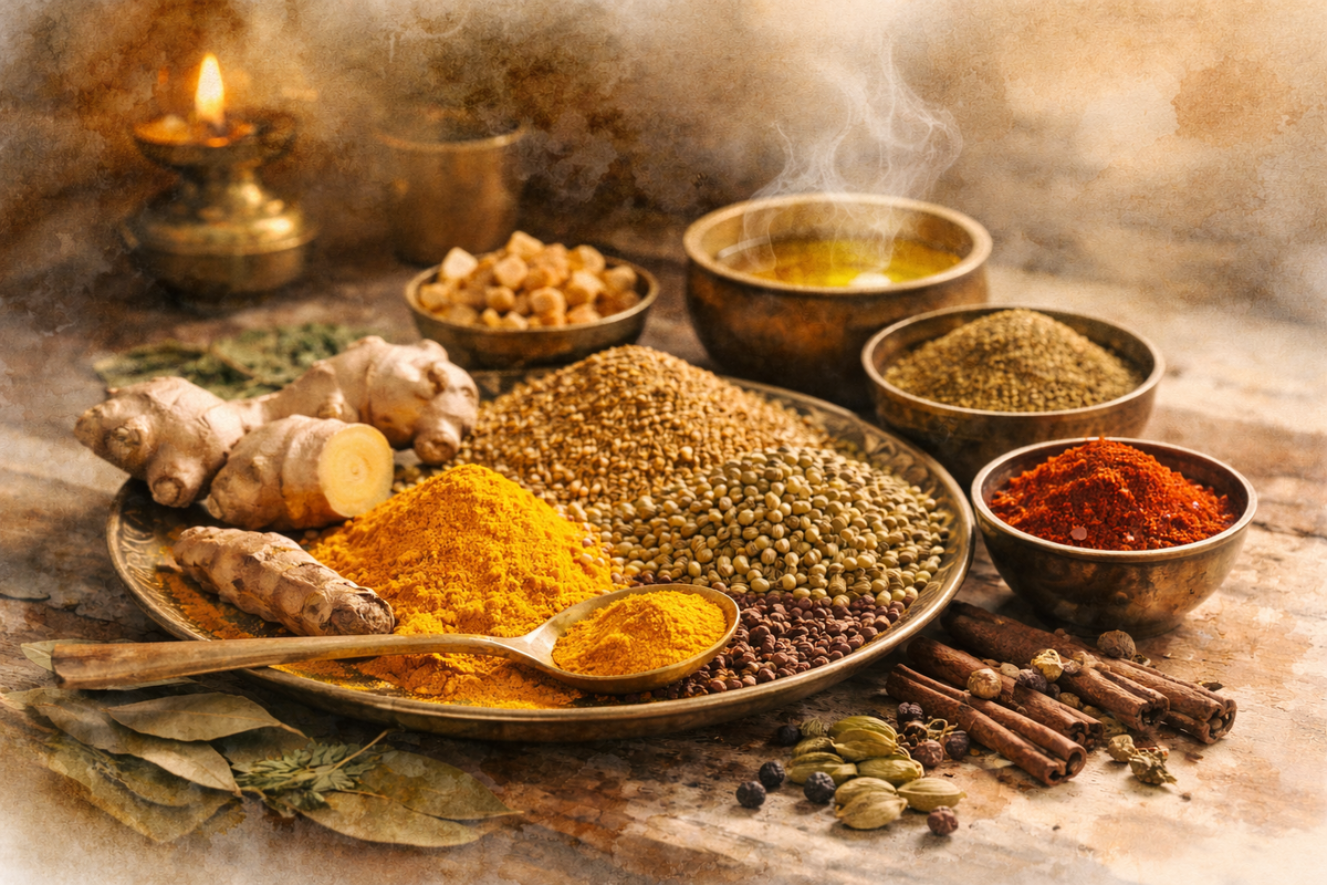 Варёная гречка. Тушёные овощи. Никакого сахара, никакого фастфуда. Я была уверена, что питаюсь правильно. Но после обеда - тяжесть. К трём часам дня - вялость, хотелось лечь. Пищеварение работало как-то медленно, без энергии. Я не понимала, в чём дело. Еда была чистая. Режим соблюдался. Чего не хватало? Не хватало специй. Точнее - понимания, зачем они вообще нужны. Специи - это не про вкус Большинство людей воспринимают специи как приправу. Посыпал сверху - стало вкуснее. Не хочется острого - не добавляй. Дело вкуса. В аюрведе другой взгляд. Специи - это инструмент, который помогает пище перевариться. Не украшение блюда, а часть его функции. Кумин убирает газообразование - особенно от бобовых и корнеплодов. Кориандр балансирует все три доши и мягко поддерживает пищеварительный огонь. Имбирь этот огонь разжигает - запускает процесс переваривания ещё до того, как еда попала в желудок. Куркума поддерживает обмен веществ. Асафетида заменяет лук и чеснок там, где они нежелательны - и при эт