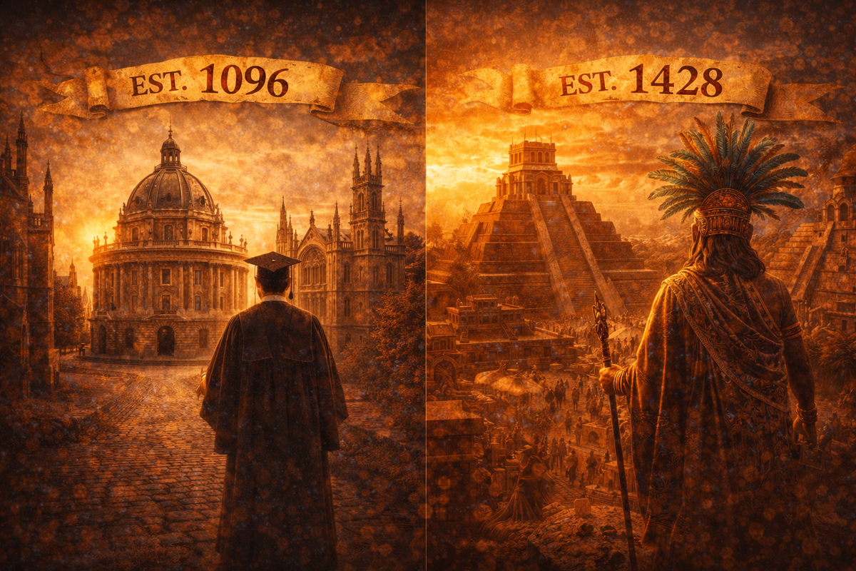 Оксфордский университет начал работу около 1096 года нашей эры. Ацтеки основали свою столицу Теночтитлан в 1325 году. Когда ацтеки ещё не построили свою империю, в Оксфорде уже учились студенты.