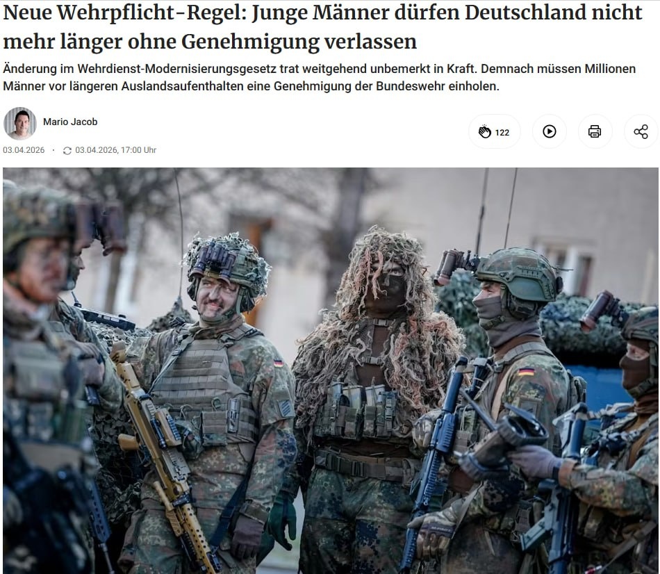 Теперь все мужчины в возрасте от 17 до 45 лет должны получать разрешение от Центра карьеры Бундесвера, если они намереваются покинуть Германию более чем на три месяца – независимо от того, отправляются ли они на учебу за границу, на работу или в длительную поездку. ❓Интересно, есть ещё что-то, что сможет этот поезд остановить? UPD: тут увидел, что новость является вбросом от телеграм-канала Ateo Breaking. Вероятно, если бы это было правдой, немало бы немцев вышло на улицу выразить своё мнение. С другой стороны, а если это прогрев? 🌐 ТГ | 🇷🇺 MAX