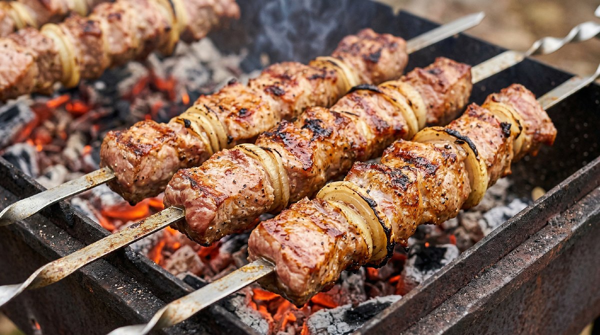 Снимаю шампуры с мангала и даю отдохнуть минуты три-четыре. Этот шаг многие пропускают, а зря. Когда мясо лежит на жару, соки внутри него находятся в движении — под воздействием температуры они стремятся от горячей наружной части к более прохладному центру. Если начать есть сразу, при надкусывании весь сок вытечет на тарелку. Если же дать мясу постоять, соки распределятся равномерно, и каждый кусок будет сочным от первого до последнего укуса.