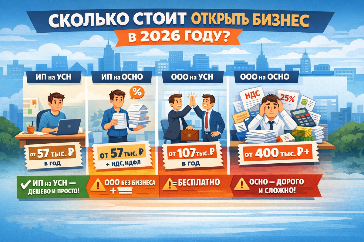 Даже без деятельности директор создает обязательные взносы. Это ключевой момент, который ломает старые схемы “открыть ООО и ничего не делать”. Вот минимальный набор, который почти всегда будет: Но дальше начинаются обязательные платежи — и вот они решают всё. Минимум за год: И всё. Даже если нет дохода — платить нужно. 👉 от 57 390 ₽ в год Это самый доступный легальный вход в бизнес в России. На старте цифры похожи: Но дальше начинается: 👉 В “нуле