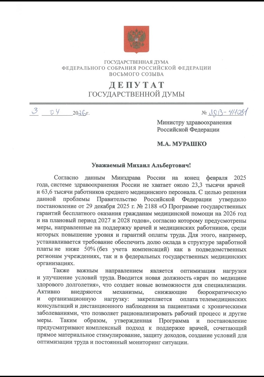 Вместе с лидером нашей фракции Сергеем Мироновым направили обращение министру здравоохранения РФ Михаилу Мурашко с предложением ввести