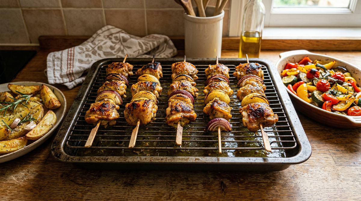 Медово-горчичные шашлычки. К базовому маринаду добавьте столовую ложку мёда и столовую ложку зернистой горчицы. Мёд при высокой температуре карамелизуется и даёт потрясающую глянцевую корочку с лёгкой сладостью. Горчица добавляет остроту и глубину. Эти шашлычки выглядят как ресторанное блюдо — тёмно-золотистые, блестящие, с пикантным ароматом.