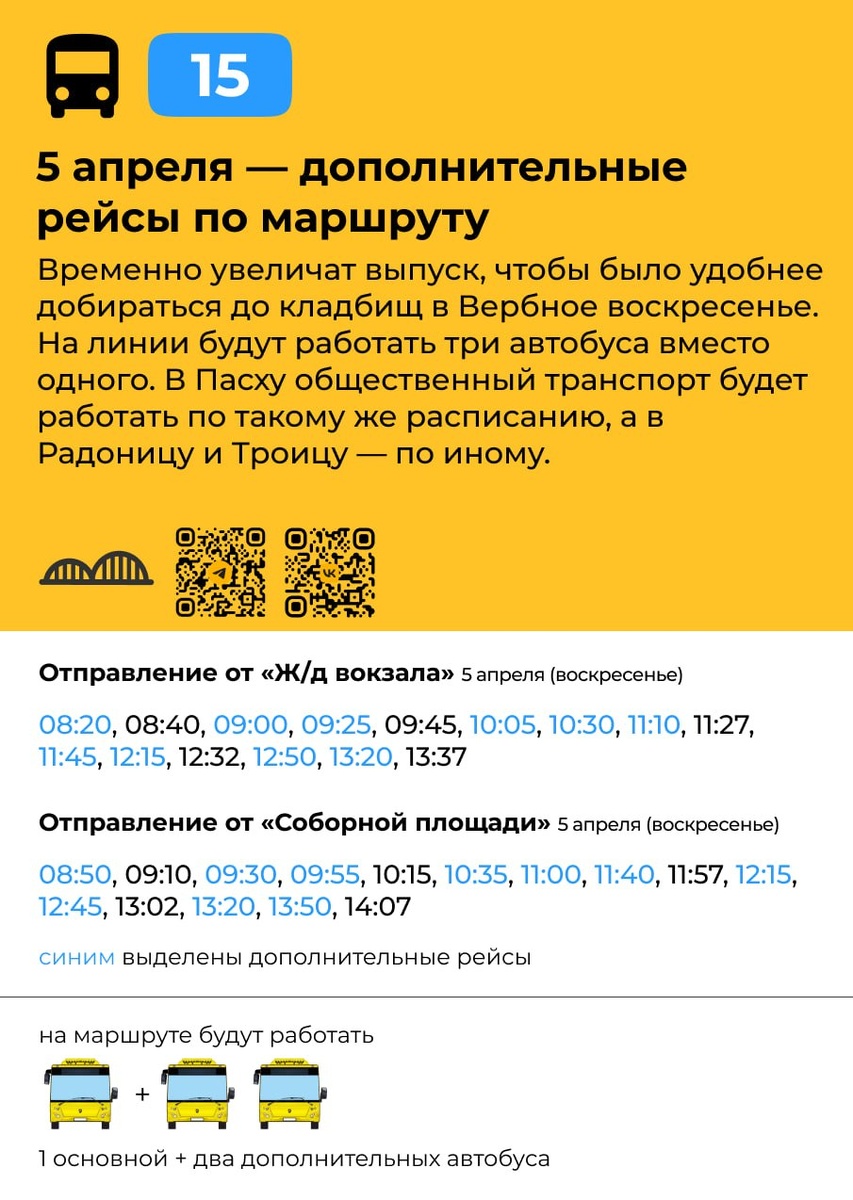 Временно увеличат выпуск, чтобы было удобнее добираться до кладбищ в Вербное воскресенье. На линии будут работать три автобуса вместо одного. В Пасху общественный транспорт будет работать по такому же расписанию, а в Радоницу и Троицу — по иному. Расписание с учётом дополнительных рейсов — на карточке выше.