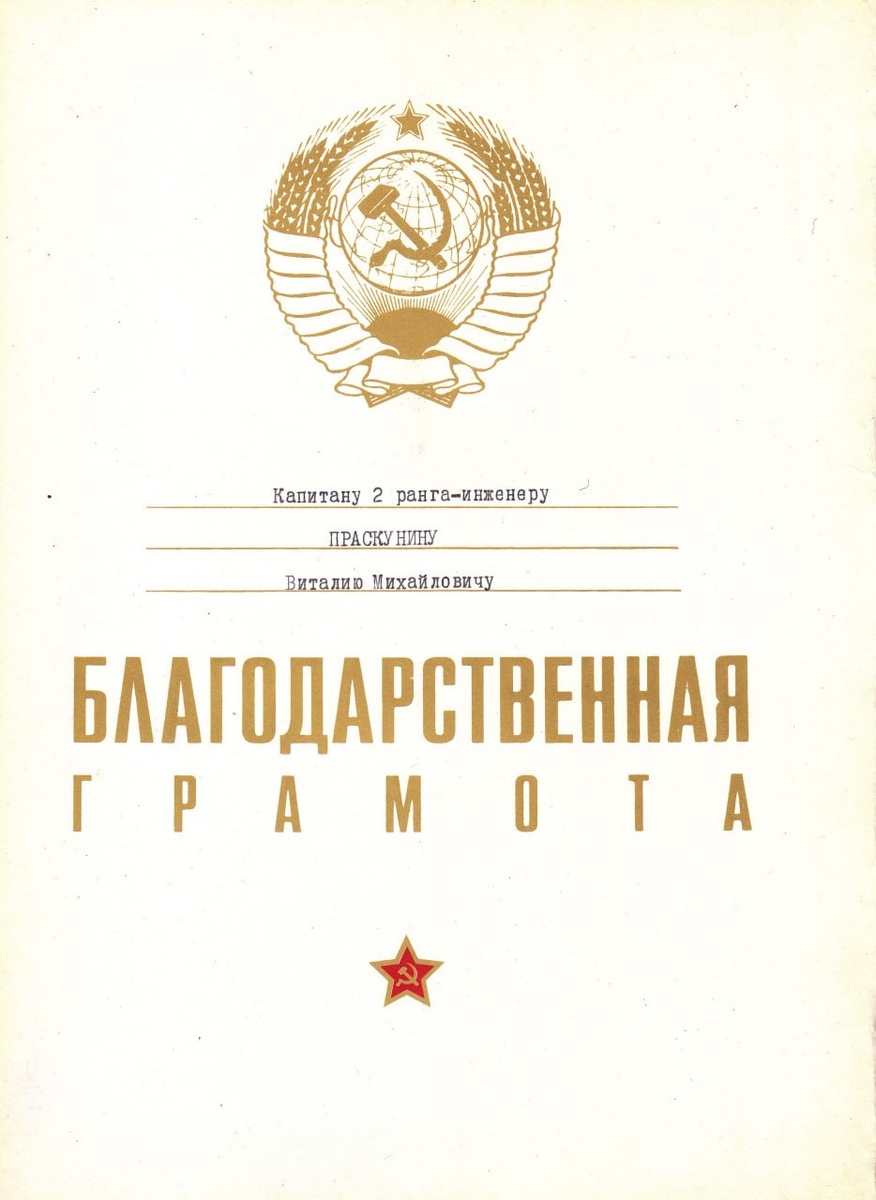Благодарственная грамота выданная капитану 2 ранга-инженеру Праскунину В