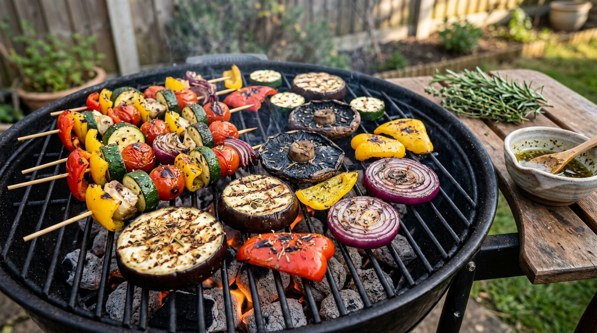 Теперь про жарку. Когда угли готовы, покрыты белым пеплом и дают ровный жар без языков пламени, я раскладываю овощи на решётку или нанизываю на шампуры. Принцип такой: одинаковые овощи — на один шампур. Не мешаю баклажаны с перцами, грибы с помидорами. У них разное время готовности, и только так я контролирую процесс для каждого вида отдельно.