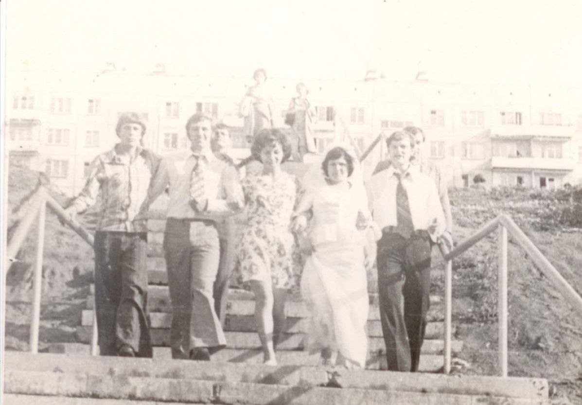 ПУБЛИКУЕТСЯ ВПЕРВЫЕ На фото 1977 год. На снимке на лестнице, расположенной между домами Шлюзовая, 2 и 20, на фоне дома Русская, 3, запечатлена Комсомольская свадьба моей подруги Тузковой Галины и Виктора. Я на этой свадьбе была свидетельницей. Фото: из семейного архива автора - Куприяновой Людмилы Васильевны.