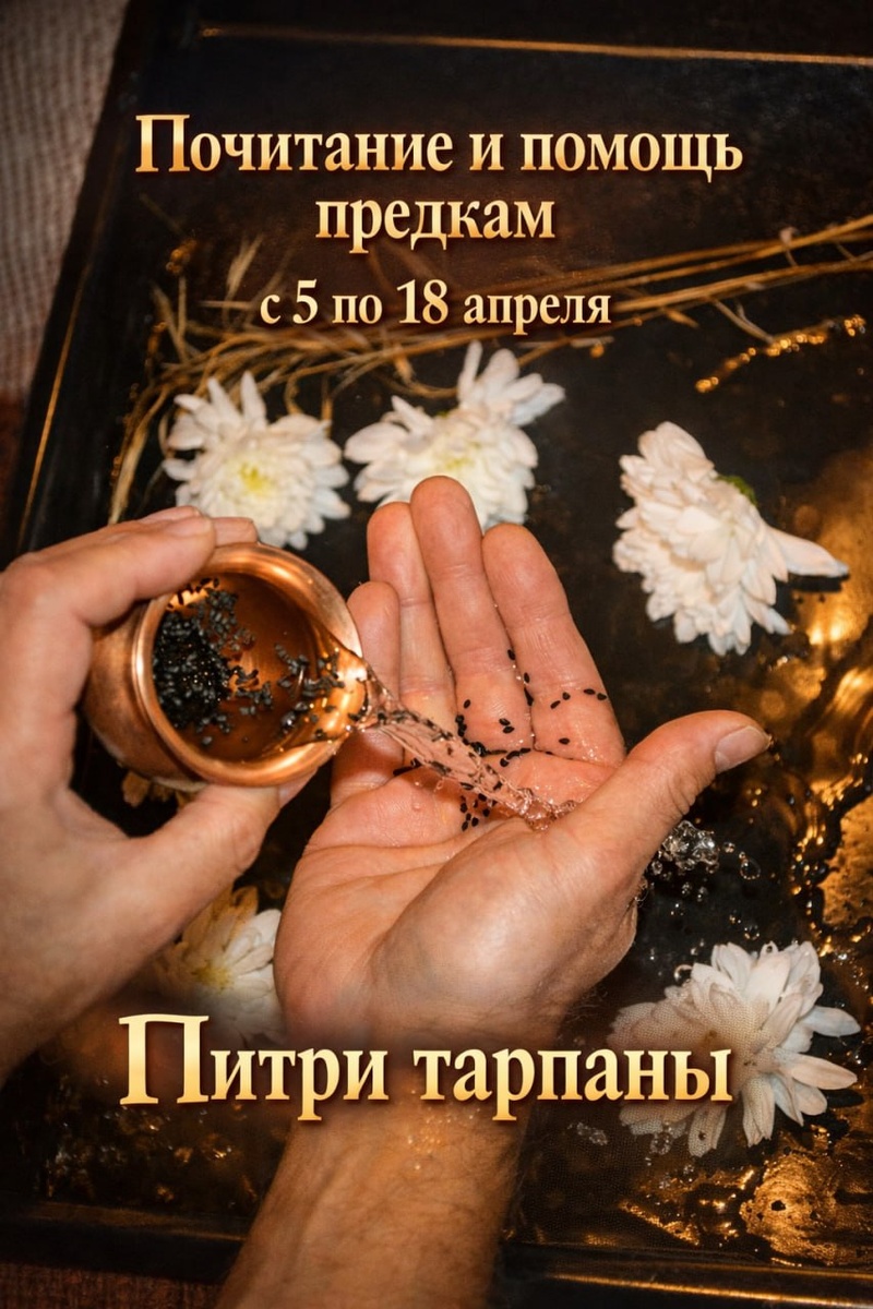 Тем, кто ушел из этого мира для помощи с кармическими последствиями их деяний. И ныне живущим, для их долгой жизни в здравии и процветании. 5 - 18 апреля открываем период тарпан. 12 апреля - родовая ягья для процветания. 19 апреля - Акшая тритья ягья в самый благоприятный день года! Приглашаем провести индивидуальные обряды для Рода с 5 по 18 апреля. Варианты участия: 1. Онлайн (или заочно тогда предоставляется запись) - проводится тарпана и после нее сразу пуджа для вас и вашего Рода (или той Души для которой проводится тарпана) - 6000 р. 2. Только заочно (запись предоставляется, без онлайн участия) проводится тарпана для вас и вашего Рода (или той Души для которой проводится тарпана). В этот же день мы проводим еще несколько тарпан для других заказчиков и их Родов, и завершаем общей пуджей для этих нескольких Родов. Вам предоставляется запись вашей тарпаны и общей пуджи. 4000 руб. Скидка делается за счет общей пуджи. ВНИМАНИЕ! Пуджа является обязательной частью практики почитания