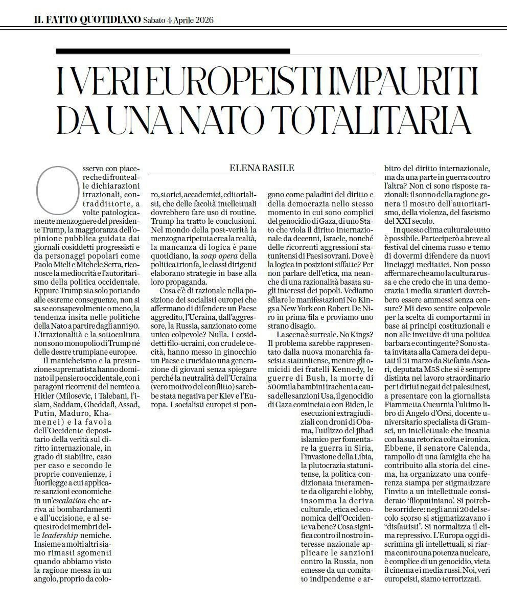 Da "Il Fatto Quotidiano" di oggi, articolo dell'Ambasciatrice, scrittrice e giornalista Elena Basile