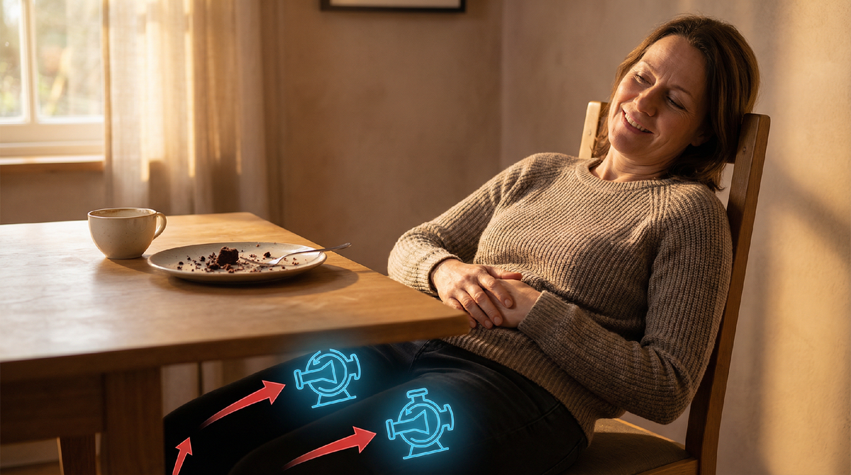 И здесь мы совершаем главную ошибку - ложимся на диван «переваривать». Мышечные топки выключаются. Система паникует: «В трубах слишком много жидкого топлива, насосы стоят, давление растет! Срочно убираем это в кладовку!». И ваше топливо заботливо упаковывается в жировые запасы на животе и боках. С другой стороны, резко вскакивать и бегать нельзя - желудок полон, и тряска сломает процесс пищеварения. Нам нужен элегантный физический обходной путь: включить мышечные насосы без лишних движений.