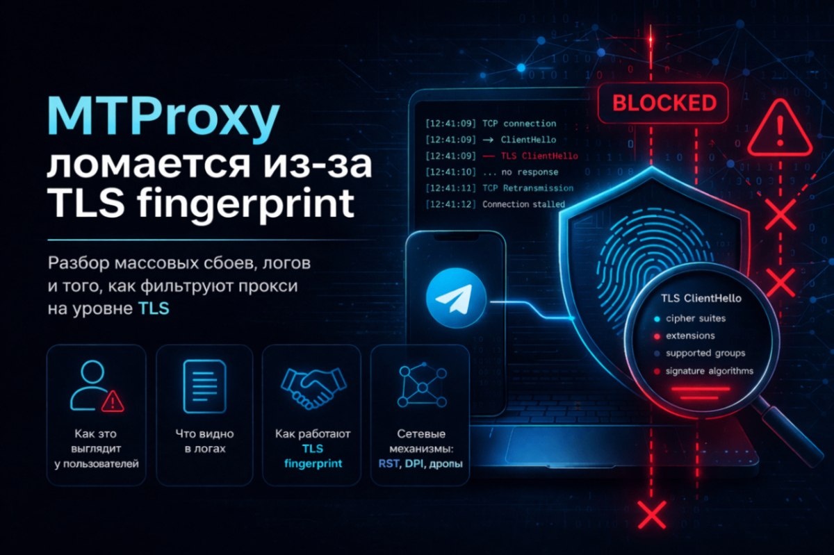С 1 апреля у MTProxy зафиксированы массовые сбои: клиенты зависают на этапе TLS ClientHello, медиафайлы не загружаются, наблюдаются TCP retransmission. Серверы функционируют штатно, однако анализ сетевого трафика показал, что DPI начал фильтровать соединения по специфическому TLS-фингерпринту. Пакеты либо сбрасываются, либо сессии прерываются поддельными RST-пакетами до завершения рукопожатия. Использование десктопного клиента с изменённым TLS-отпечатком позволяет восстановить стабильную работу. https://dzen.ru/id/5c0e38ff46ef5c00aaa80527