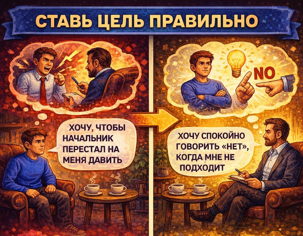 ? Перед работой над своей личностью лучше подготовиться. Не в смысле морально настроиться и помедитировать на пустоту, а конкретно — сформулировать что есть и что хочешь. Вот человек приходит и говорит — на работе постоянно прогибаюсь под начальником, соглашаюсь на всё, потом злюсь на себя. Ок, это «есть». А что хочешь? «Хочу чтобы он перестал на меня давить» 🧠 Уже лучше, но это ещё не цель, это пожелание. Потому что «чтобы он перестал» — это про другого человека, а мы работаем с тобой. Переформулируем — хочу спокойно говорить нет, когда мне не подходит. Или — хочу продвигать свои условия без внутреннего ступора. Вот это уже про тебя, с этим можно работать И дальше разматывается клубок — тут и состояния, и эмоции, и восприятие, и мотивация, и куча всего другого. Они все друг с другом связаны, их надо системно прорабатывать и разворачивать. Если у человека есть база — какая-то техника постановки цели, которую он знает и использует — отлично, приходит с готовой формулировкой. Если