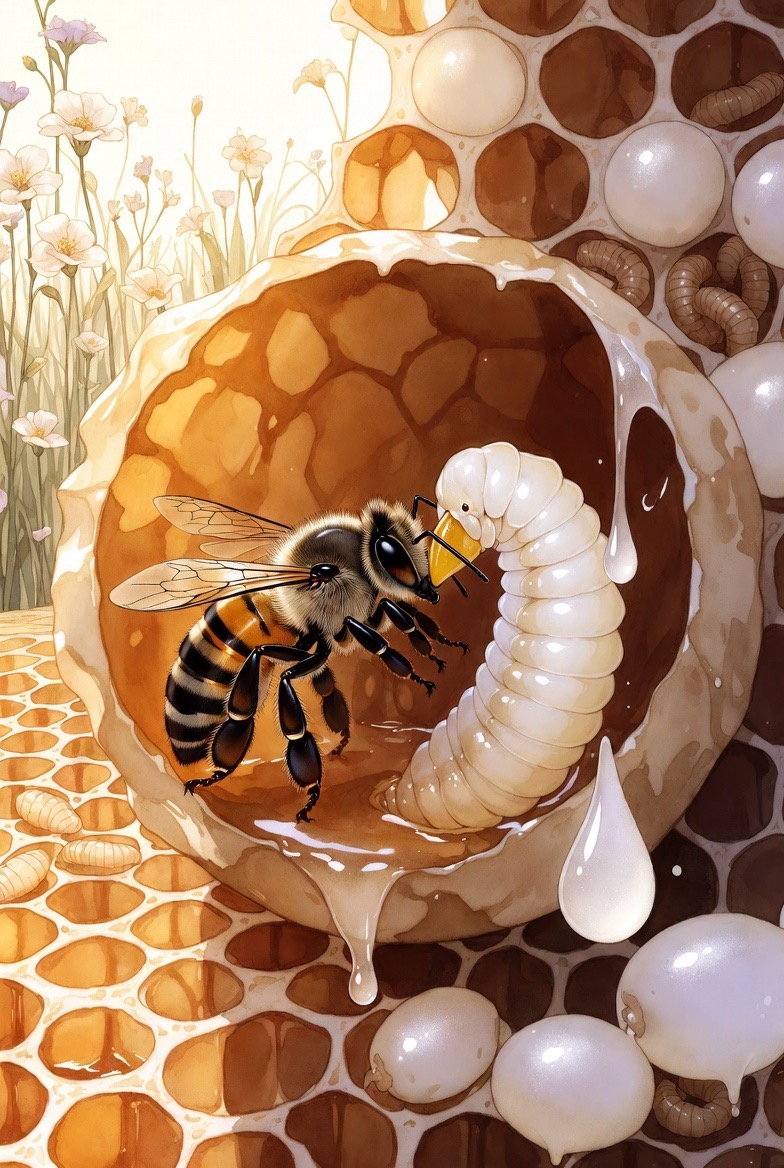 Они берут мёд и пергу (пыльцу), перерабатывают их внутри своего организма и выделяют готовое молочко. Это не просто еда — это концентрированный, высокоусвояемый «супер-коктейль», созданный самой природой.