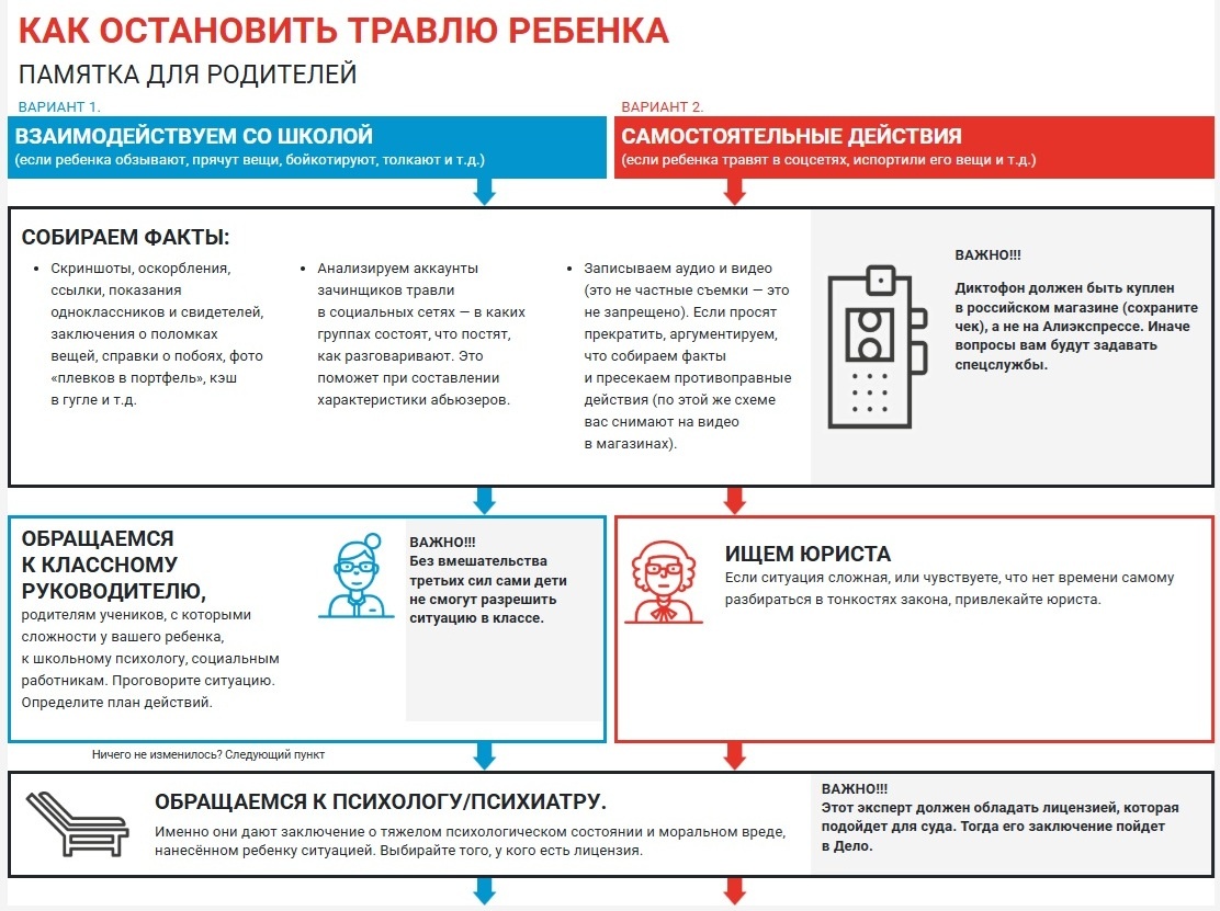 Это памятка, которую я составила вместе с юристами после того, как мой старший сын столкнулся с травлей в 6-7 классах. По сути - здесь мой путь в решении проблемы. А потом я написала книгу в помощь родителям "Буллинг. Как остановить травлю ребенка". Чтобы вдохновить других действовать. Пусть не пригодится! Но я предпочитаю жить по принципу: предупреждён - значит - вооружён!