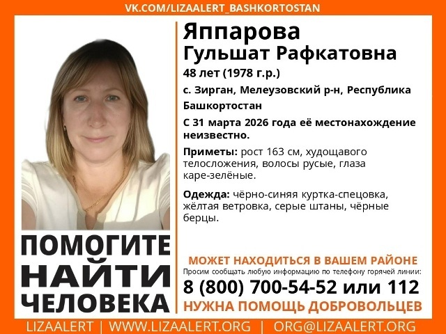 В с.Зирган при странных обстоятельствах пропала 48-летняя Яппарова Гульшат Рафкатовна. С 31 марта 2026 года её местонахождение неизвестно.