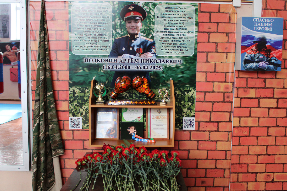 6 апреля - День памяти выдающегося боксёра Тайшетского района, бесстрашного Защитника Отечества, героя СВО, участника операции по освобождению Суджанского района Курской области, одного из тех, кто ценой своей жизни остановил прорыв врага в Белгородской области и спас тысячи мирных жителей, кавалера Медалей «За Храбрость», «Жукова», «За боевое отличие», «Участнику СВО» и Ордена Мужества (посмертно) - гвардии старшего лейтенанта Артёма Николаевича Подковина. К этой трагической дате Федерация бокса Тайшетского округа открыла в зале бокса Спортивной школы уголок памяти Артёма Подковина — чтобы подрастающее поколение знало и помнило нашего героя, его подвиги и ту высокую цену, которую мы платим за мир. На мероприятии присутствовали родители и родственники Артёма Николаевича, его близкие друзья-спортсмены, ветераны СВО, представители администрации и думы округа, школы №5, в которой он учился, отряд юнармейцев, носящих его имя, мэр Тайшетского округа А.С. Кузин и депутат Государственной Думы