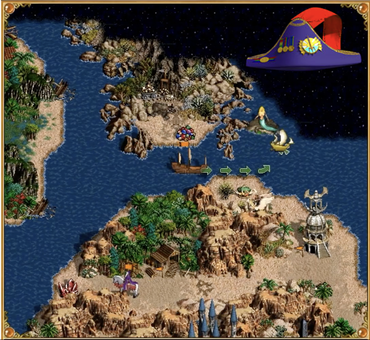 Ещё один способ надурить ИИ (как будто мы и так его уже мало надурили), но для этого понадобится сборный артефакт Шляпа Адмирала. Напомню, что артефакт позволяет высаживаться с лодки и подниматься на неё без потери очков передвижения. Компьютерному оппоненту невозможно это понять, поэтому он никогда не будет ожидать от вас такого подвоха. А вы этим и воспользуетесь. В случае когда вражеский замок располагается где-то на берегу, а внутри сидит герой с мощной охраной, которую вы не в силах пробить, — просто следуйте путём адмирала. Задействуя силу артефакта Шляпа Адмирала, высаживайтесь на берег, захватите какие-нибудь шахты противника и возвращайтесь на корабль к концу своего хода, чуть отплыв от берега, чтобы оппонент не напал на вас прямо на корабле. ИИ, конечно же, выбежит из замка, чтобы вернуть себе свои шахты, зная, что вам нужен будет один день на высадку. И когда враг закончит свой ход вне замка, тут вы ВНЕЗАПНО выпрыгиваете из корабля с полным запасом хода и захватываете его за